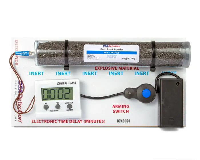 The X-ray correct, inert, Electronic Time Delay (Minutes) firing circuit contains all of the necessary components of an improvised explosive device (IED). The circuit is fully functional and will demonstrate that the firing switch has been activated by emitting an audible tone or illuminating the LED in the blasting cap. The circuit board contains an X-ray correct battery, wire, switch, detonator, and inert explosive.