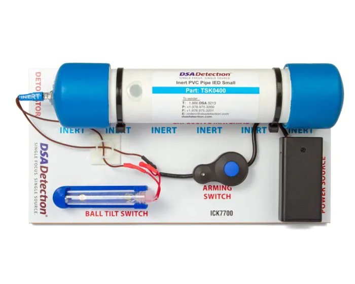 Powered by two AA batteries, this IED circuit would be activated when the improvised ball in the tilt switch comes in contact with the two wire leads. The pipe bomb is a PVC pipe with inert black powder. The X-ray correct black powder simulant is engineered to have the same density and effective atomic number (Zeff) as the real explosive threat.