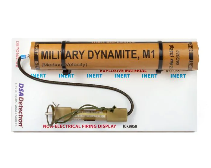 The display simulates an explosive device that is activated by an M81 fuse igniter. The M1 dynamite simulant is engineered to have the same density and effective atomic number (Zeff) as the real explosive threat. For international orders, the M81 igniter is replaced with a cast M60 replica.